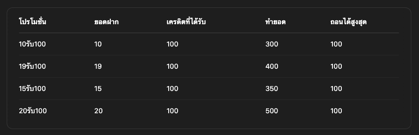 จากตารางข้างต้นจะเห็นได้ว่า 10รับ100 เป็นโปรที่ใช้เงินน้อยที่สุด เหมาะมากสำหรับผู้เล่นที่อยากทดลองระบบของเว็บก่อนลงทุนจริง